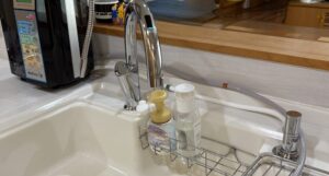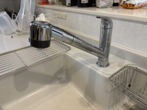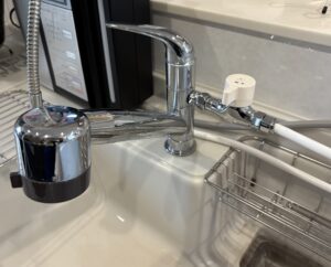 水栓は『ミラブルキッチン水栓』のため、吐水口に接続金具をつけるのも勿体ない!との事で