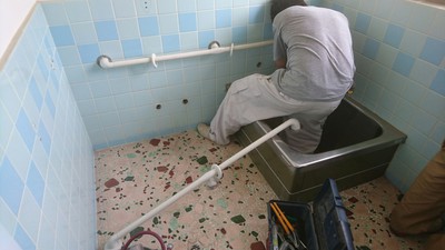 解体前に蛇口や手すりなどを外します。