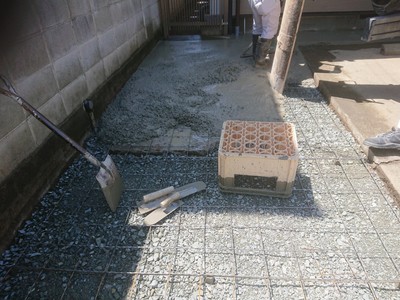 配管後、駐車場になるためワイヤーメッシュを敷いて土間コンクリートの