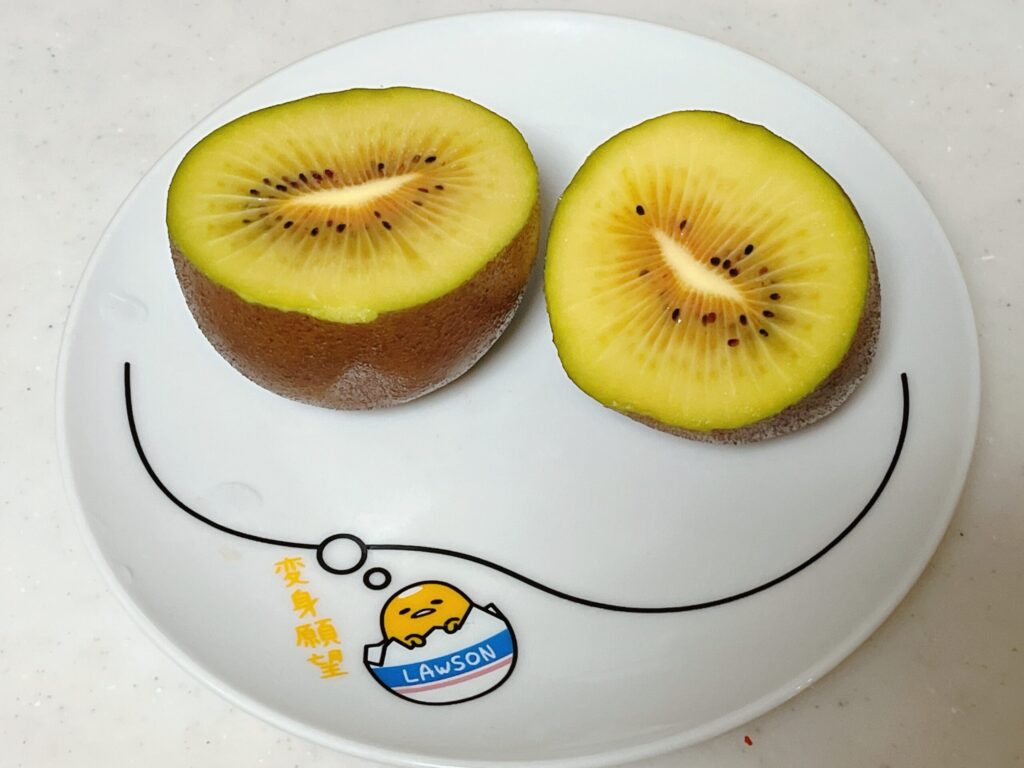 真ん中がレッドキウイで周りはゴールドキウイ、さらに縁がグリーンキウイと3種類が混ざったキウイです!!
