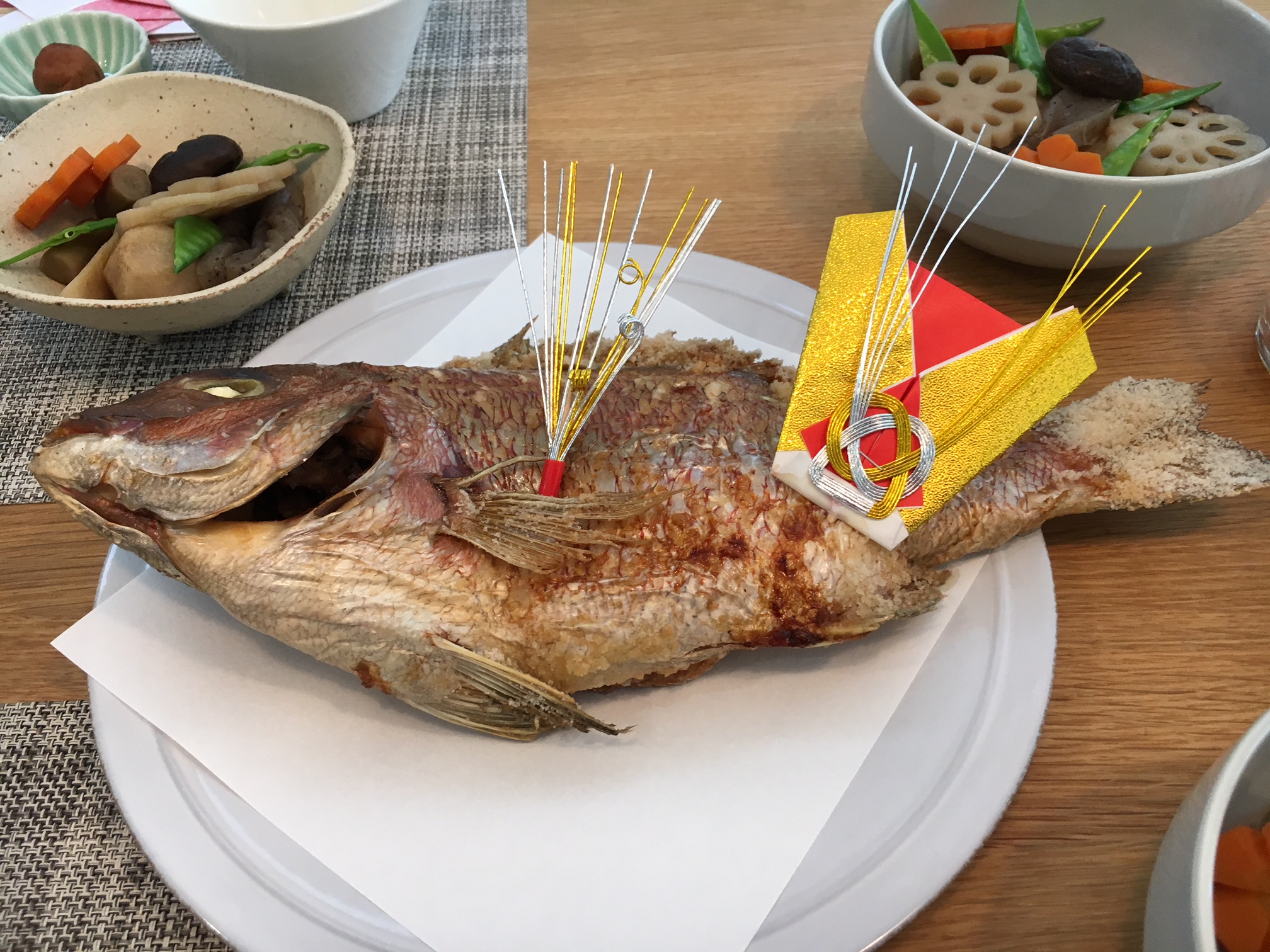 鯛は、私が買ってきましたが、後の料理は、娘が頑張ってつくりました)^o^(