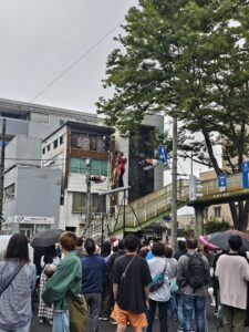 信号機と同じ高さに、綺麗なお姉さんが演目を披露していました。