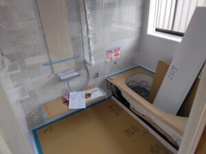 明日は木工事仕上げ作業と脱衣場内装工事が行われます。