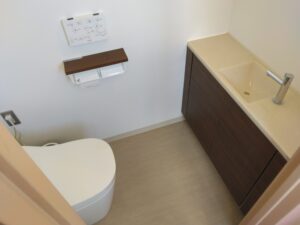 既存トイレと手洗いを撤去し、壁クロスと床ロンリウム貼り替えが完了した後にPanasonicさんの「アラウーノ」とLIXILさんの手洗い「キャパシア」を設置させていただきました。