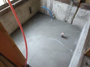 既存浴室解体後に脱衣場床から500mm下がった浴室床に、120mm程の土間コンクリートが打設されました。