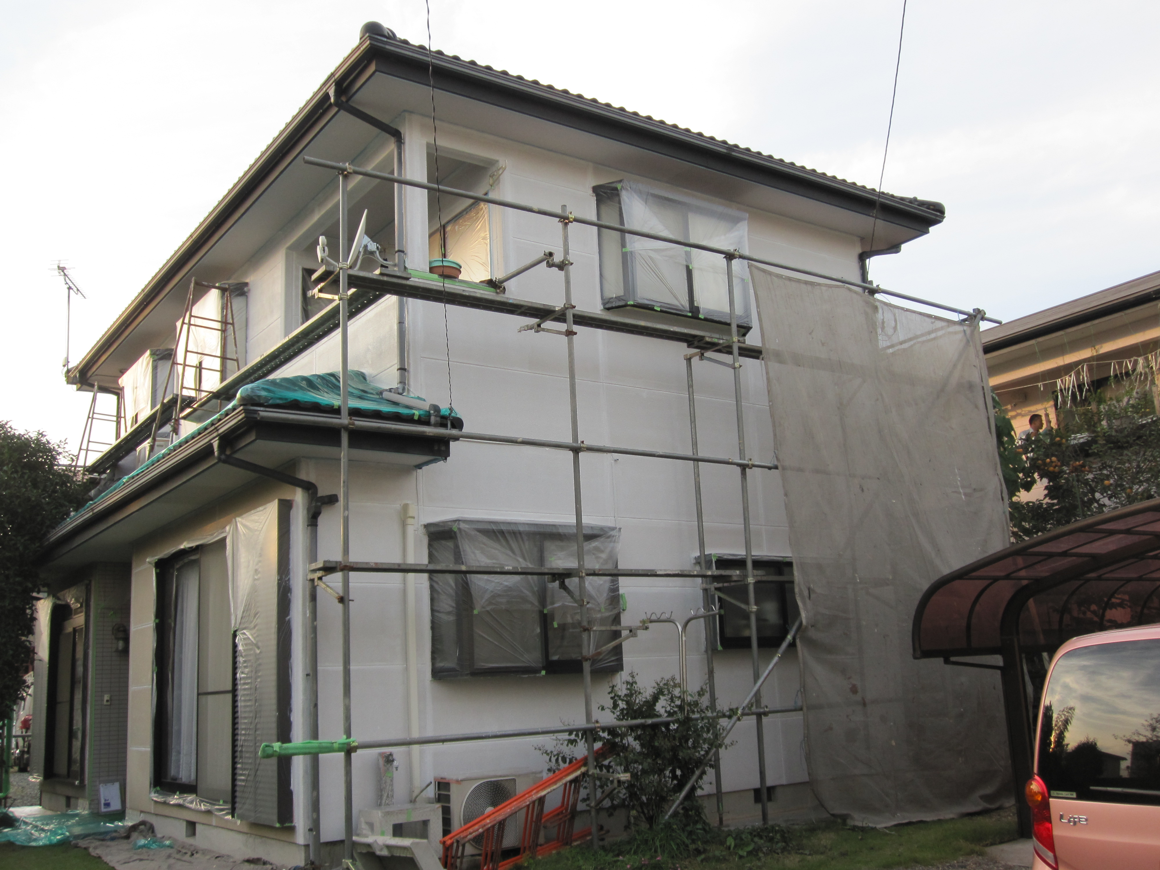 足場組み立てが終わり、外壁を高圧洗浄し、養生をして、下塗り完成です。
