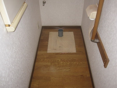 便器を取外し、床を一部開口し、排水の位置を替え、断熱材を入れます、