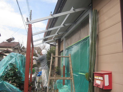 前橋市 K 様邸 テラス 工事着工中です、鉄骨組み立てが完成し、