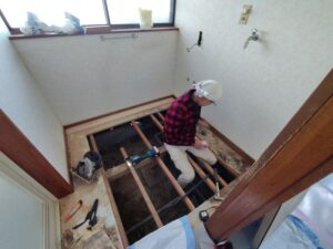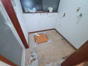 洗面化粧台、洗濯パンを外し、今日、脱衣場
