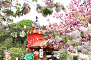 長く続く八重桜の並木道を武者行列見ながら散歩してきました。