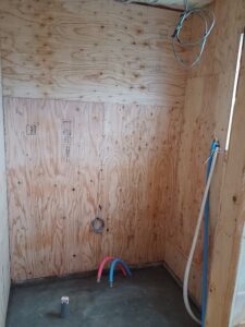 本日は浴室造作工事が終了致しました。高野建築さん、小雨によりテント対応での作業ありがとうございました。