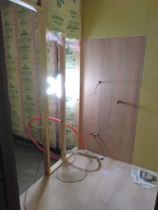 浴室断熱材及び浴室を拡張し洗面所の天井・壁・床の張替え完了。いよいよ明後日はユニットバス設置工事が行われます。T様、もうしばらくお待ちくださいませ。