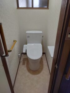ティーズ位下さんによる天井・壁クロス、床CF貼替とソフト巾木取付。その後、玉置設備さんによる新規便器取付
