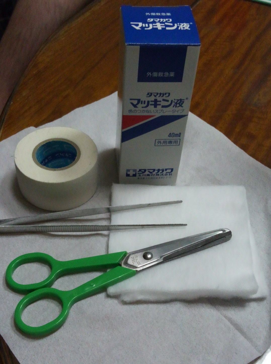 そこで手当道具を探したところ、何とか消毒くらいはありましたが