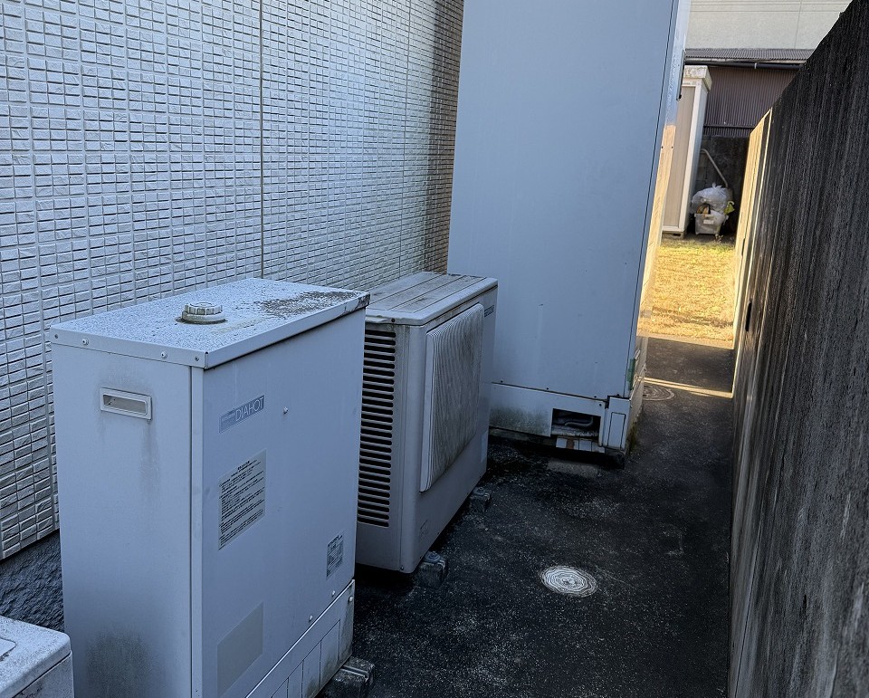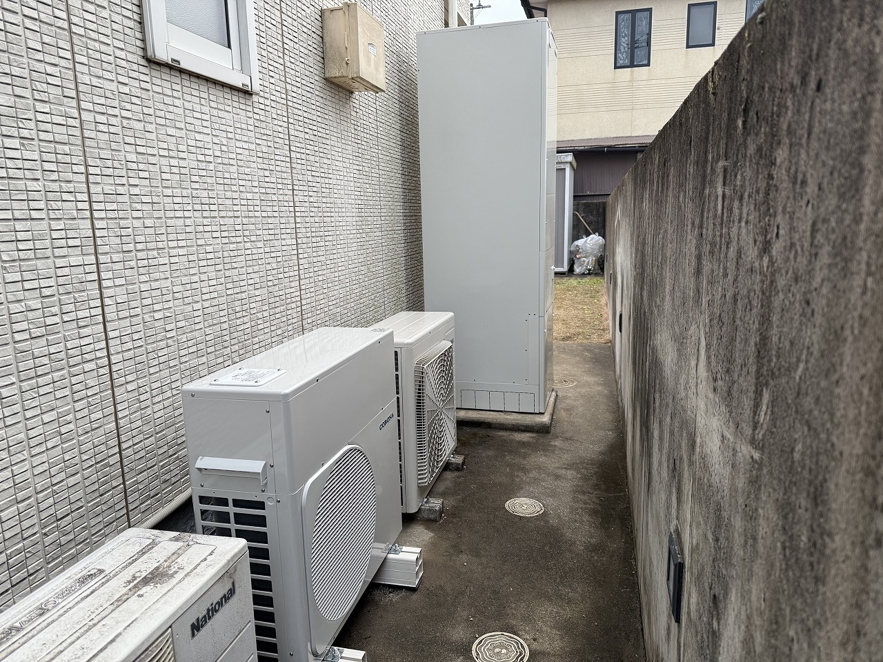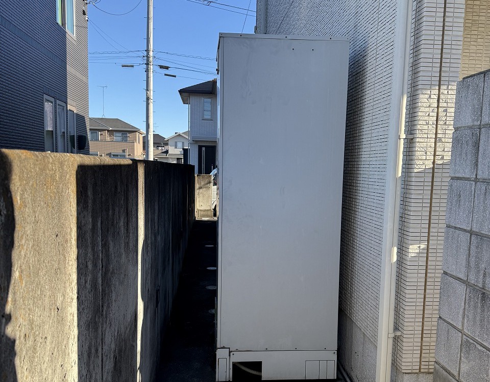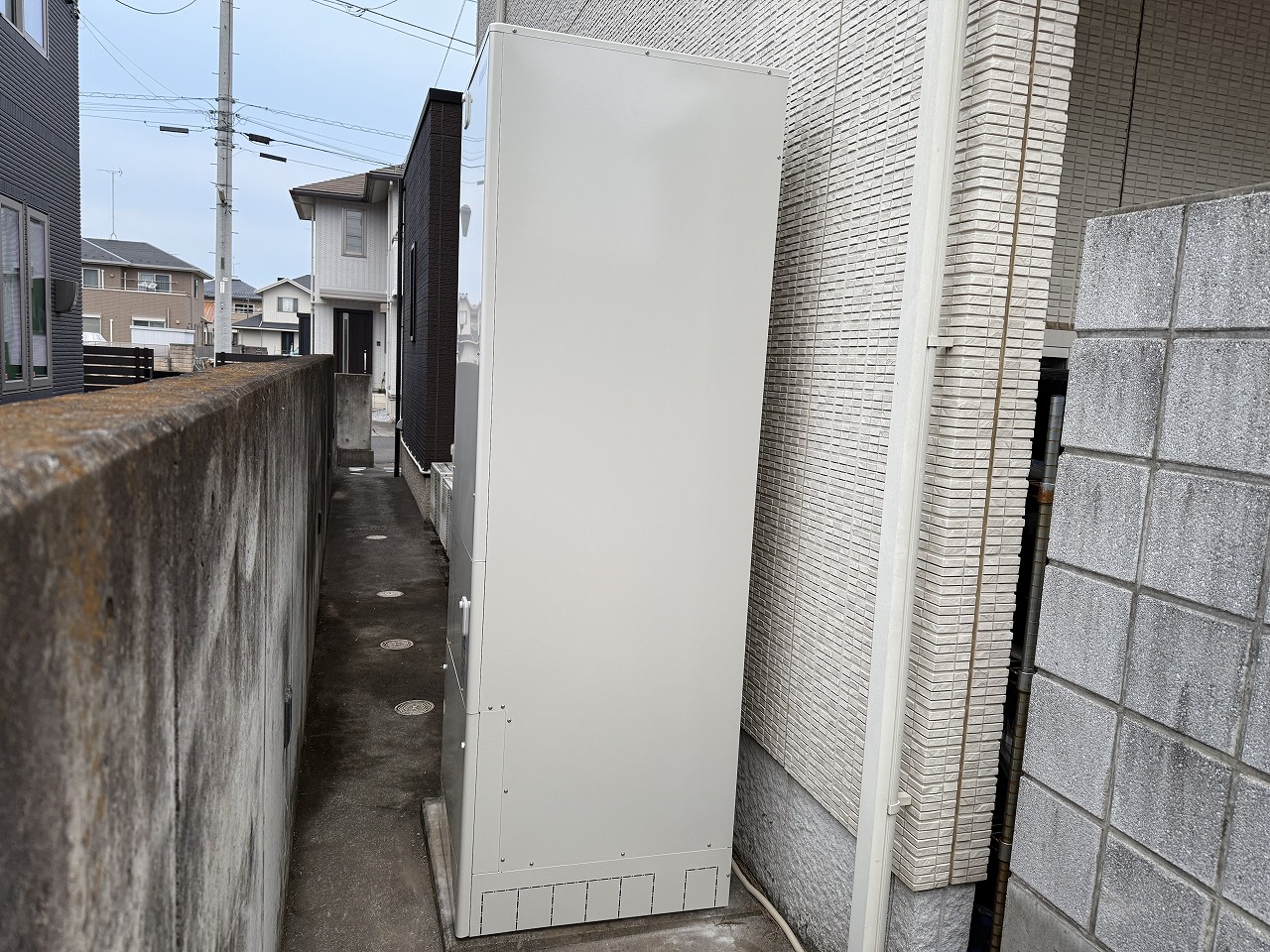 S様はエコキュートが落雷の影響により故障してしまい、交換のご依頼をお受けしました。設置スペースが狭い為、省スペース用のスリムタイプの商品を設置させて頂きました。高圧力給湯で快適なシャワーと給湯が使用できる商品です。