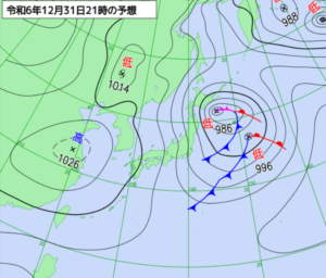 大晦日の前橋、日中は北日本を東に進む低気圧に向かって暖かい空気が入ります。